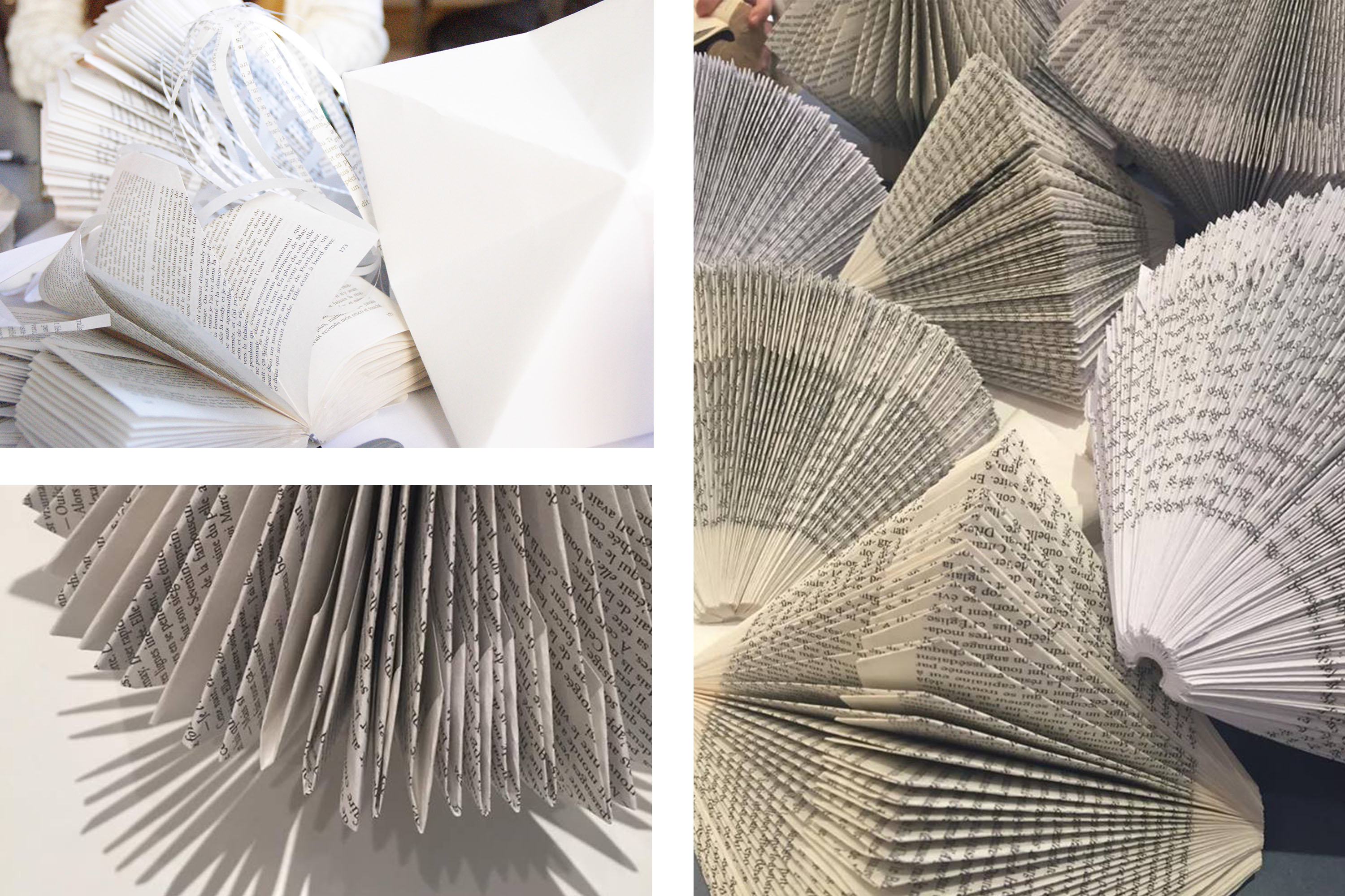 L’intégralité des éléments a été réalisée à la main, avec comme matière première le papier et la réutilisation d’épreuves non corrigées fournies par la librairie.