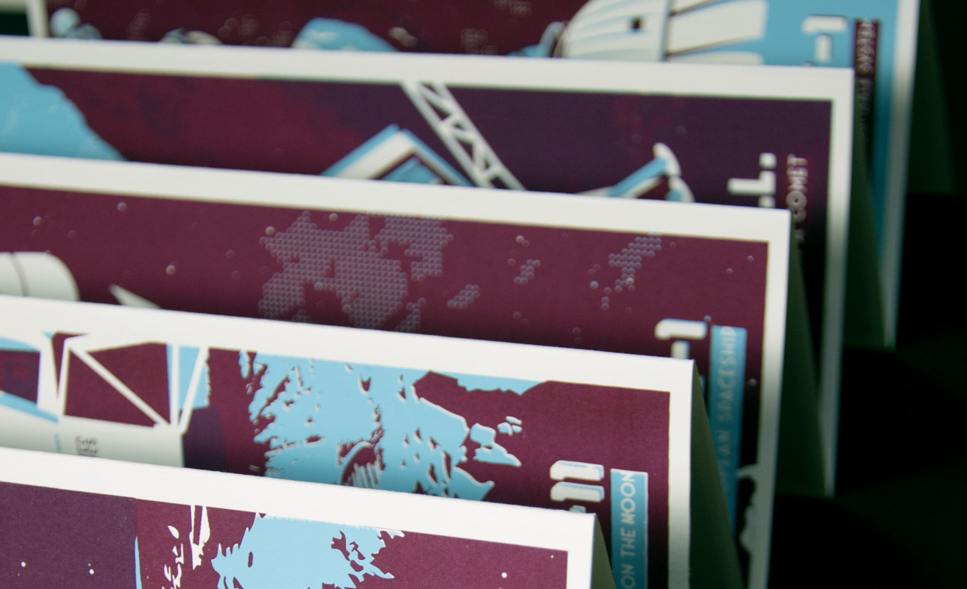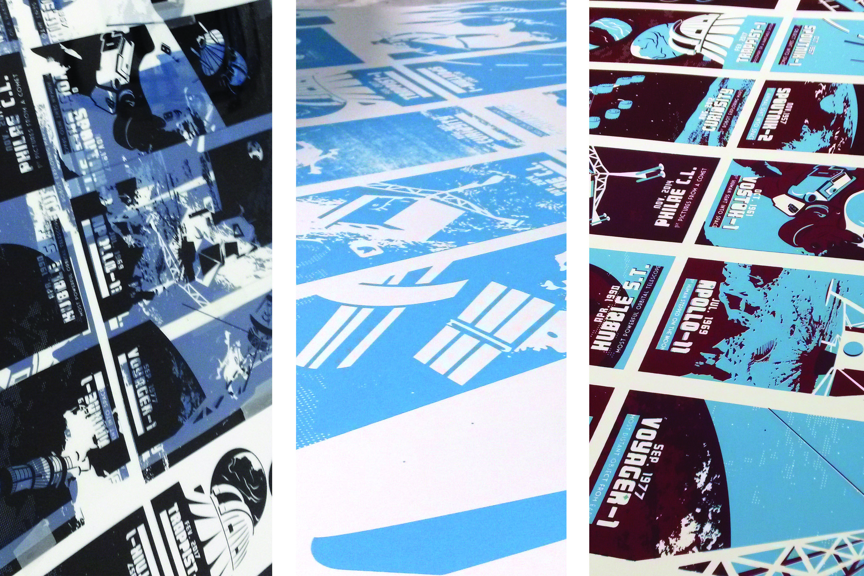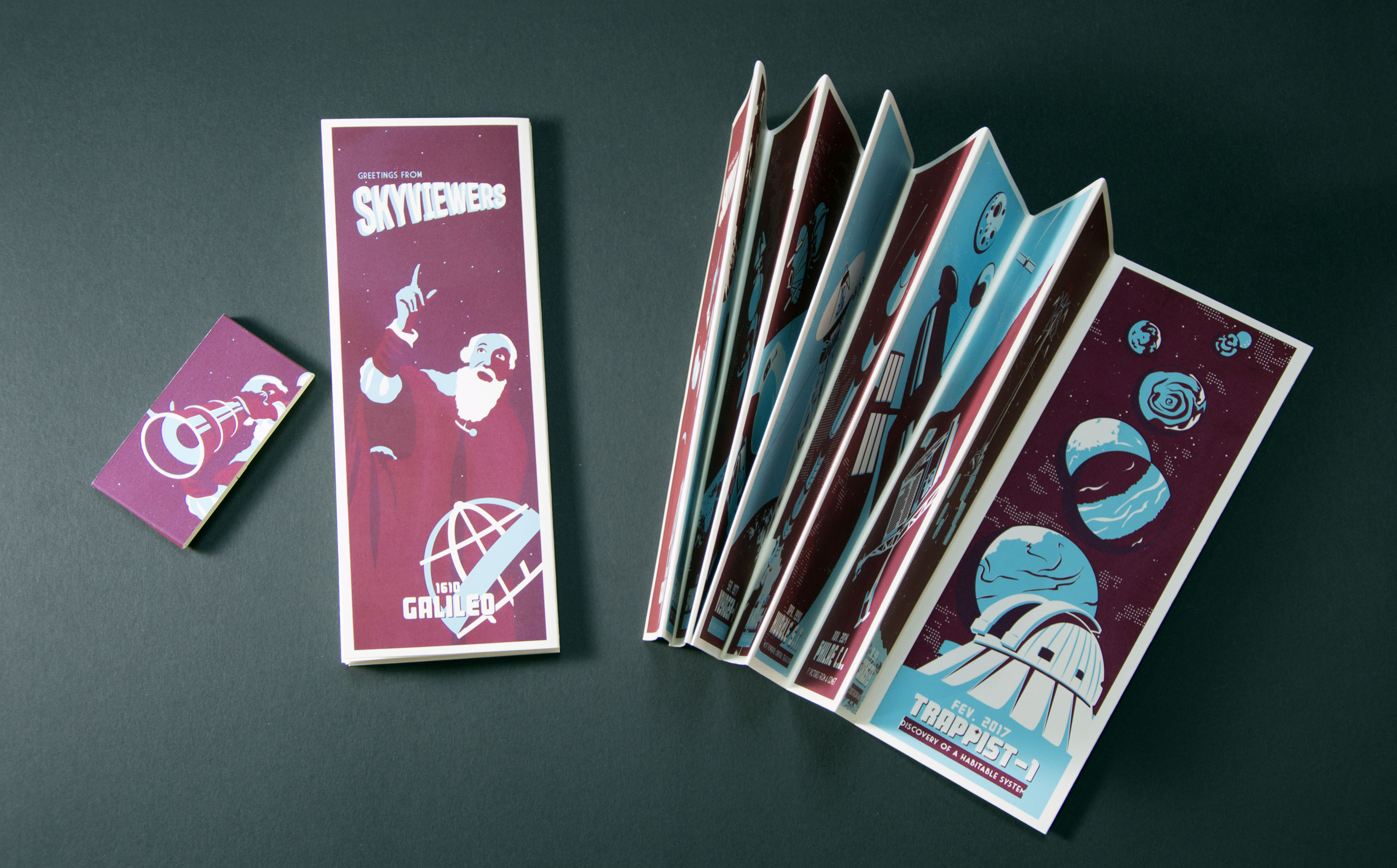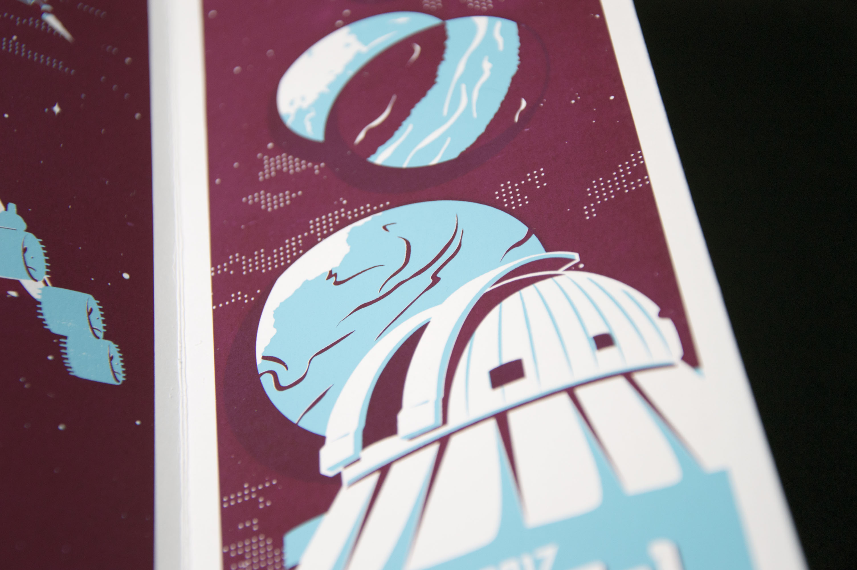 Skyviewers est un dépliant sur la conquête spatiale imprimé en sérigraphie. Ce travail a été réalisé en groupe, chaque personne créant une des 12 illustrations, « Trappist-1 » pour ma part.