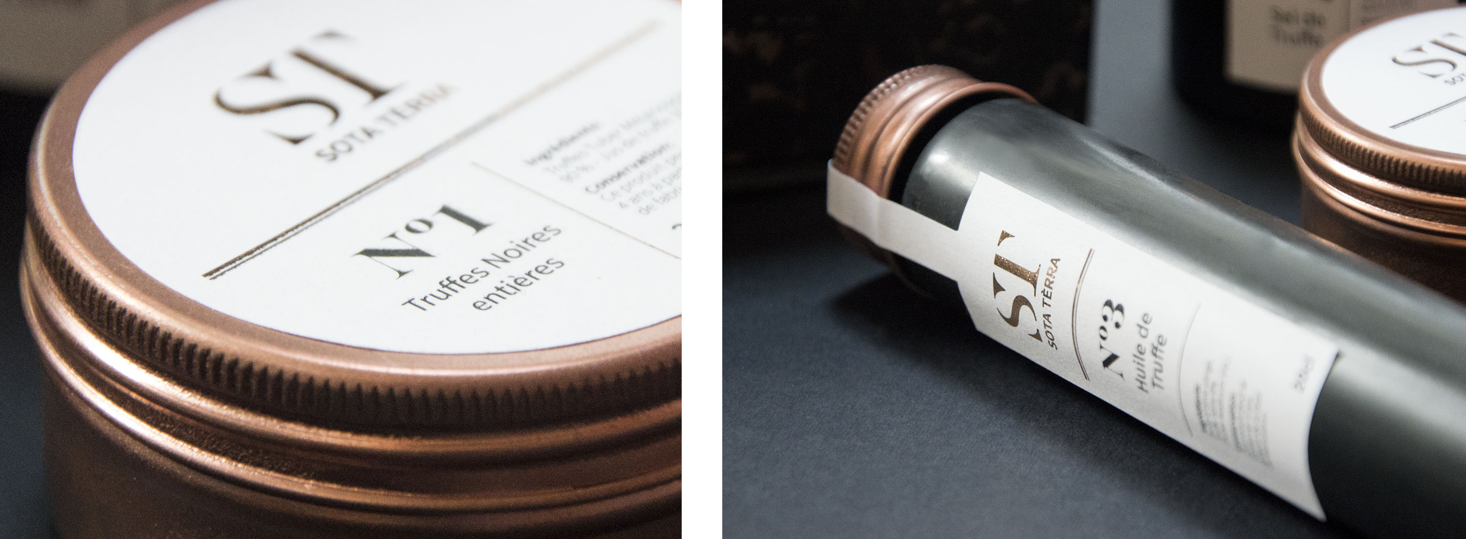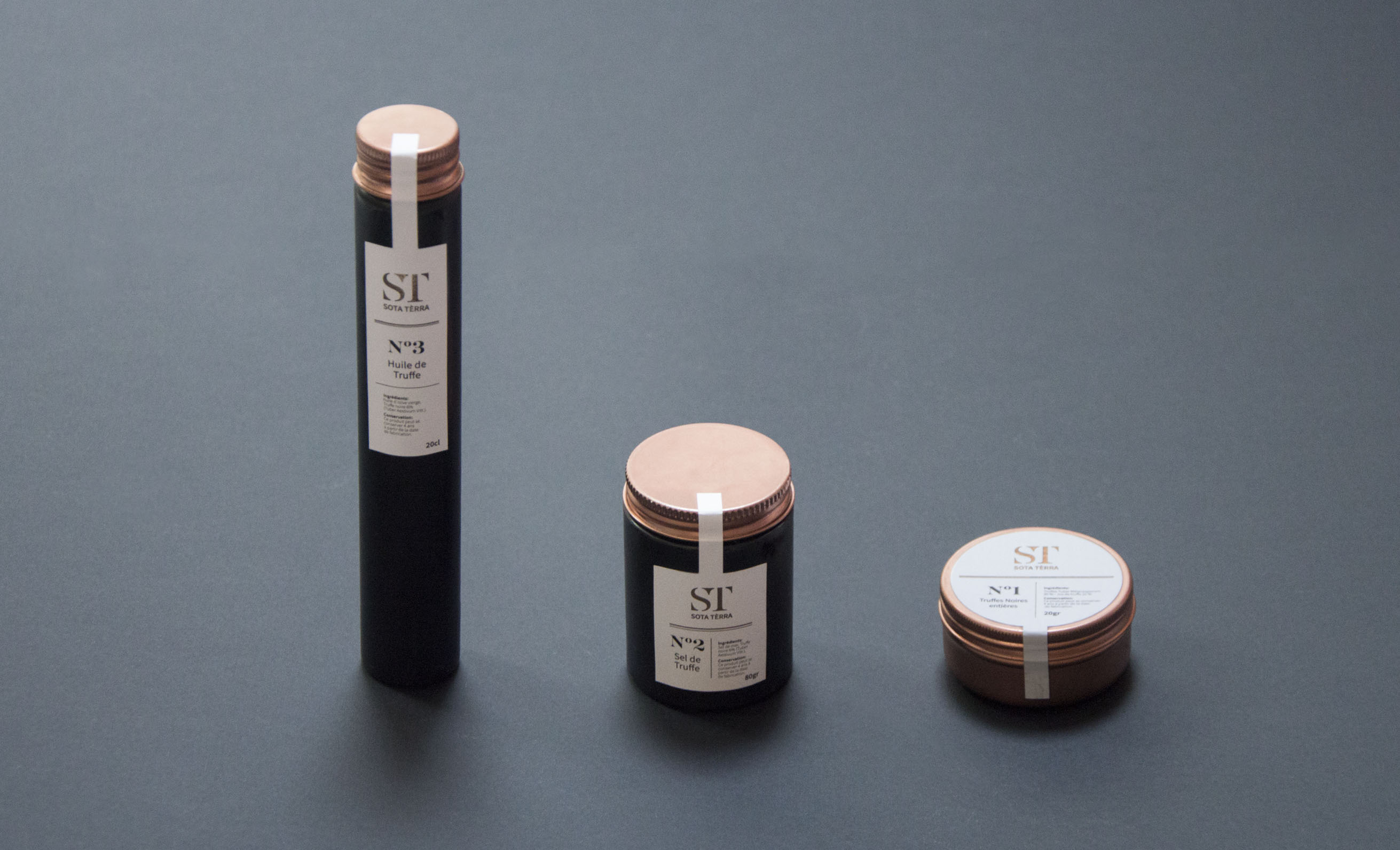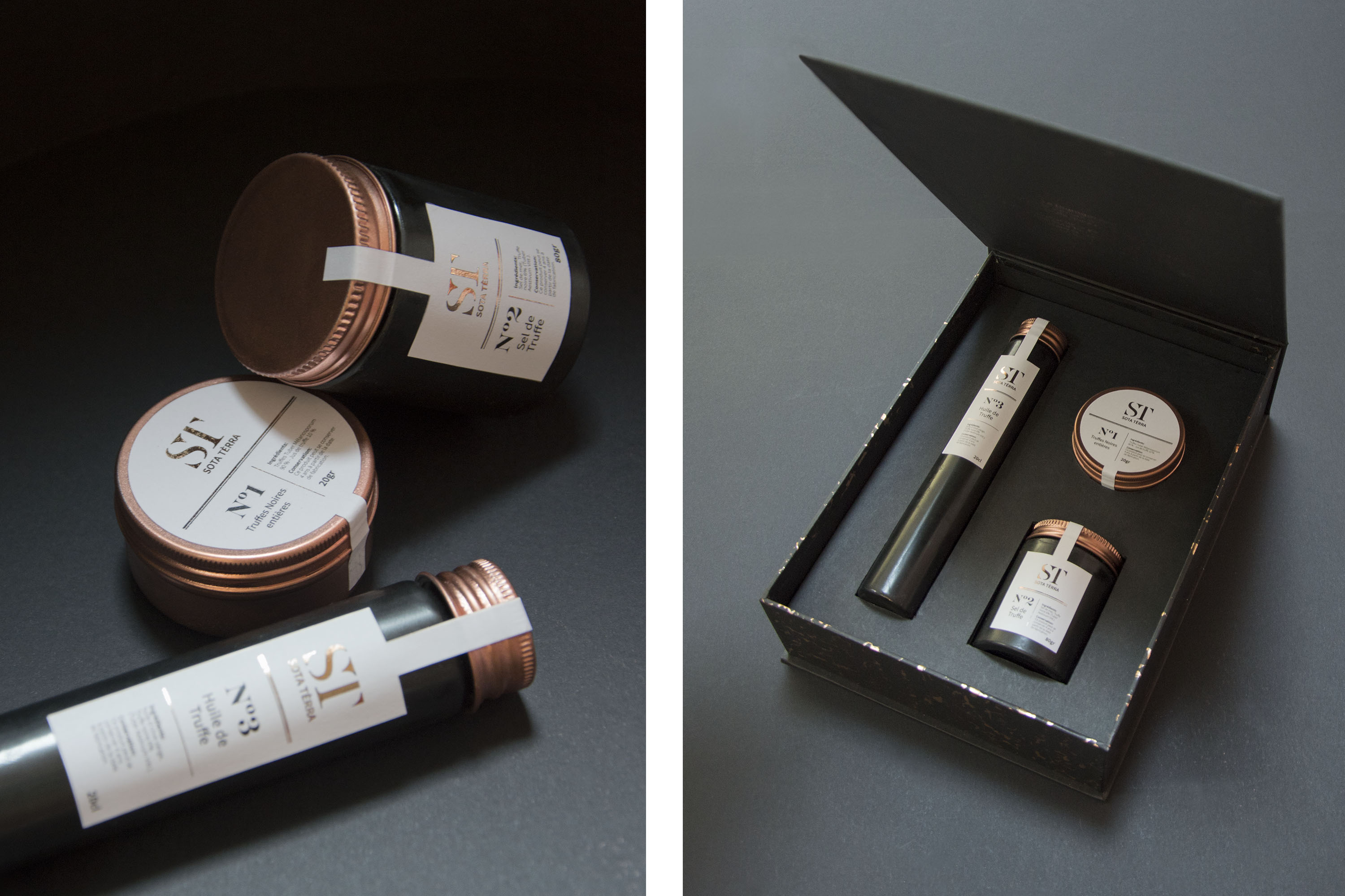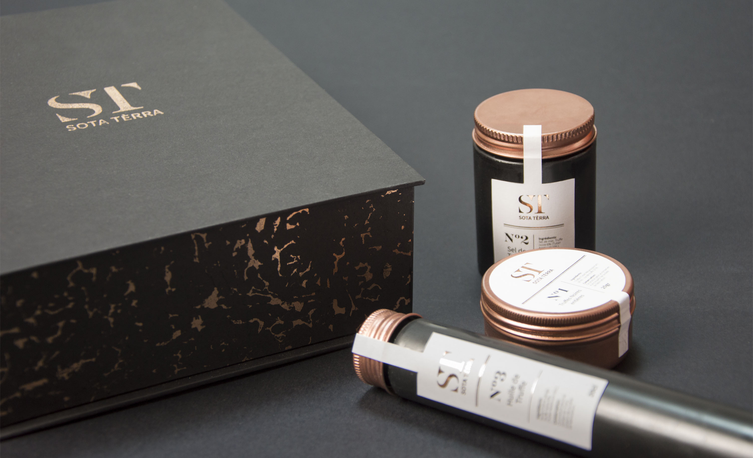 Sota Terrà, "sous la terre" en Occitan est une marque de produits haut de gamme à base de truffe. Ce produit phare du terroir aquitain est connu pour être le "diamant noir" du Périgord. Reprenant les codes de la joaillerie, ce coffret propose trois produits: truffe entière, huile de truffe et sel de truffe.