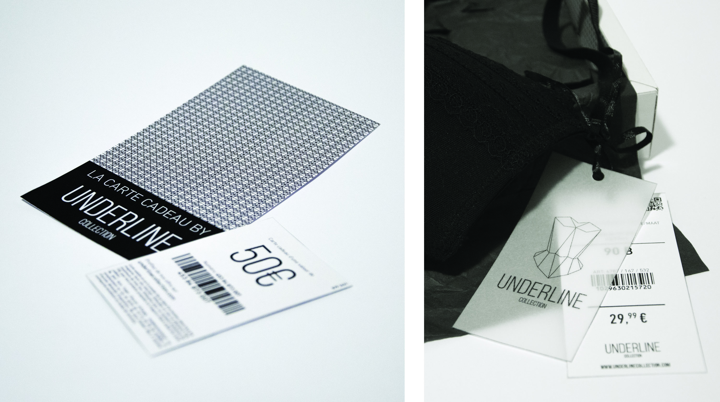 Déclinaison étiquettes et packaging, avec un logo et un motif faisant écho à la photo et aux lignes que dessine la lingerie sur le corps des femmes.